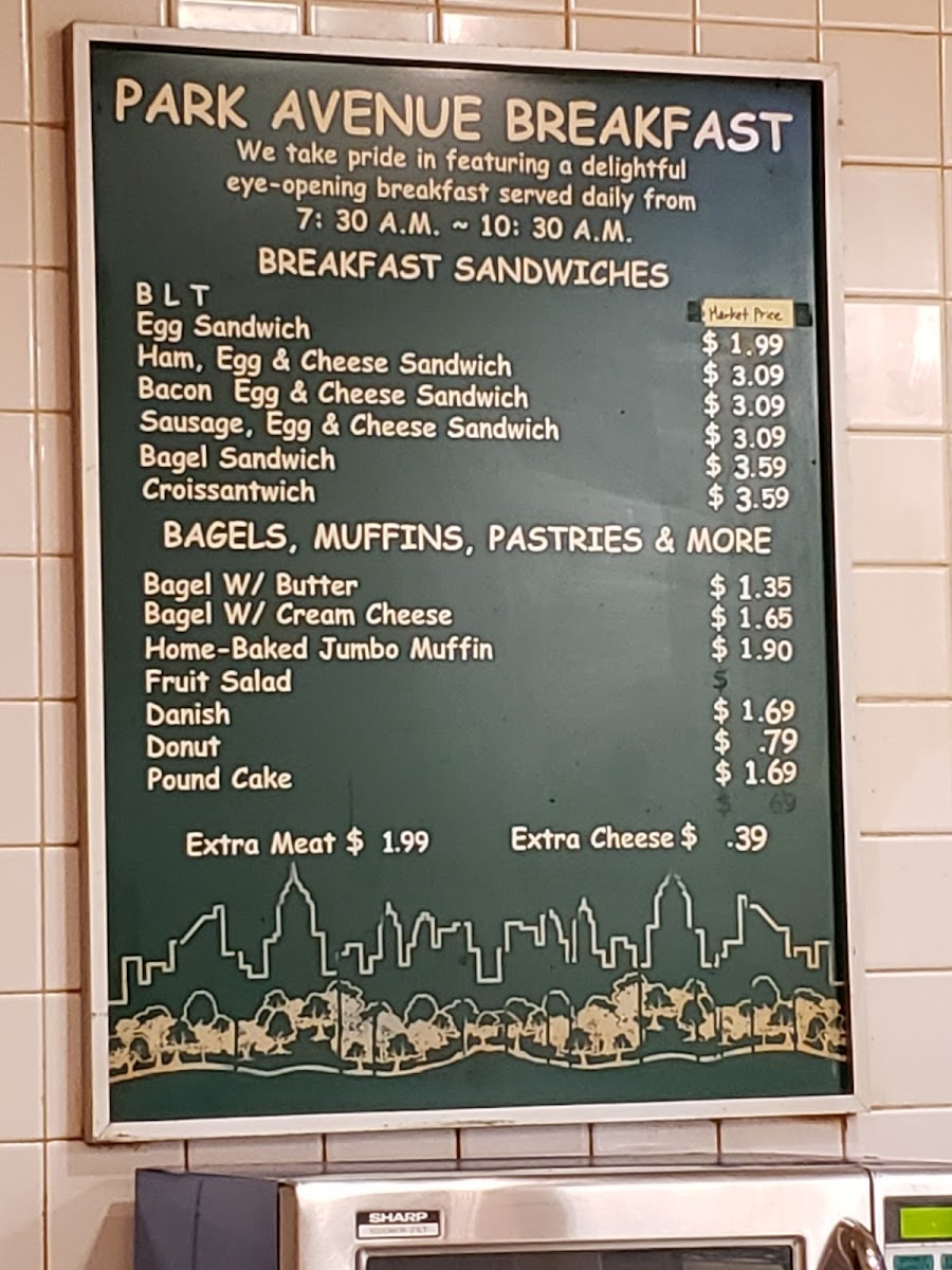 The menu at Park Avenue Cafe offers a variety of options suitable for breakfast, lunch, and light meals throughout the day. It is organized into distinct categories, making it easy to navigate and select items based on preference and mealtime needs.